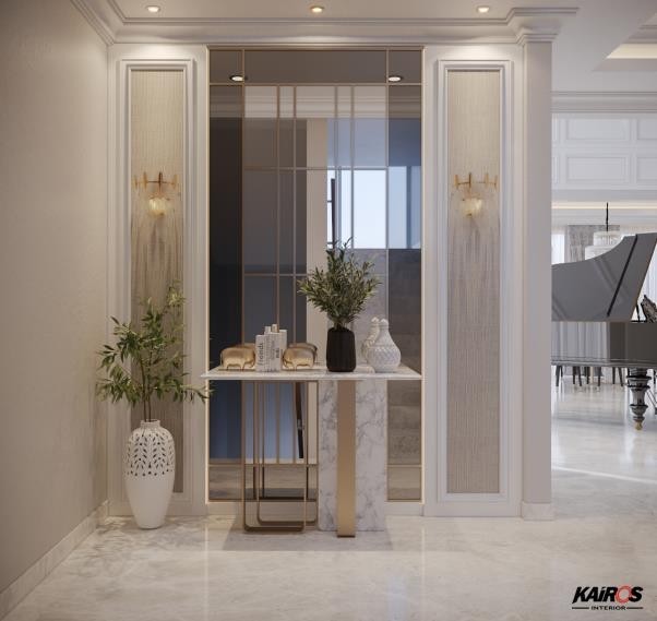 Manfaatkan sudut ruangan dengan menambahkan meja, panel. Dan dekorasi lainnya. Membuat tampilan sudut ruangan menjadi fungsional dengan tampilan yang cantik dan mewah.