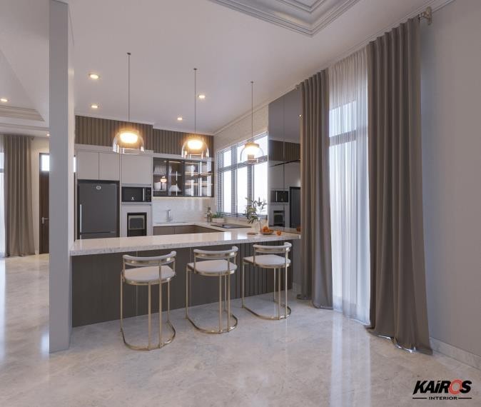 Buat pantry dengan beragam fungsi seperti menyimpan berbagai peralatan memasak dan bahan-bahan makanan dilengkapi dengan meja dan kursi bar. Selain itu dilengkapi dengan alat-alat elektronik untuk mengolah makanan, seperti Microwave dan Ovan. Agar kegiatan memasak menjadi lebih nyaman dan fleksibel.